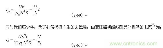 因此,(2-76)、(2-77)、(2-78)、(2-79)式最好只用于對(duì)正激式輸出的單激式開關(guān)變壓器進(jìn)行磁滯損耗和渦流損耗功率測(cè)試,因?yàn)槠涑跫?jí)線圈的電感相對(duì)比較大,勵(lì)磁電流比較?。蝗绻枰獙?duì)反激式輸出的單激式開關(guān)變壓器進(jìn)行測(cè)試,最好只用于對(duì)小功率開關(guān)電源進(jìn)行對(duì)比測(cè)試。