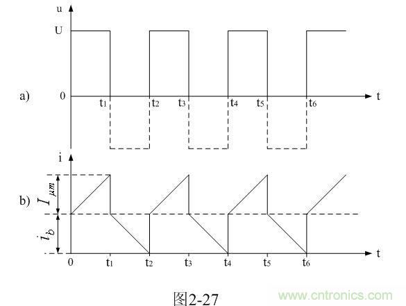 我們從圖2-27-b中可以看出,在輸入電壓作用期間,勵(lì)磁電流 是跟隨時(shí)間線性增長(zhǎng)的;而渦流損耗電流