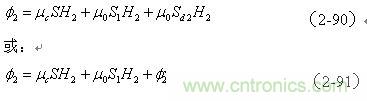 (2-91)式中,咋看起來,變壓器初級線圈N1產(chǎn)生的磁通量 全部穿過變壓器次級線圈N2,它們之間應該不存在漏磁通;但是,初級線圈在面積S1中產(chǎn)生的磁通 的方向與在面積Sd2中產(chǎn)生的磁通 的方向,正好互相相反;因此,變壓器初級線圈N1在面積Sd2中產(chǎn)生的磁通 ,仍然稱為變壓器初級線圈N1對變壓器次級線圈N2的漏磁通,其等效電感同樣稱為漏感。