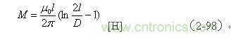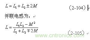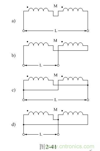 【說明】互感M有正負(fù),圖2-41-a和圖2-41-c的接法互感M為正,圖2-41-b和圖2-41-d的接法互感M為負(fù)。兩個線圈之間的互感M為: