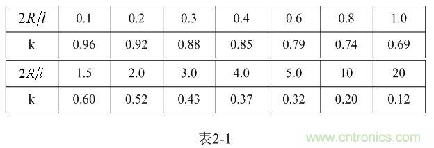 【說明】上式是用來計算多層線圈繞組、截面為圓形的空心線圈的電感計算公式。長岡系數(shù)k可查閱表2-1,系數(shù)c可查閱表2-2。當(dāng)線圈內(nèi)部有鐵芯時,有鐵芯線圈的電感是空心線圈電感的