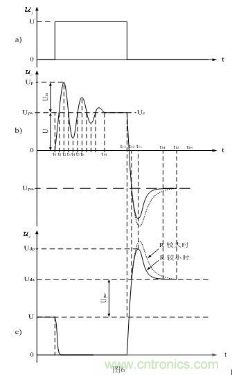 這里順便指出,圖6-b的波形是很難測(cè)量到的,因?yàn)榉植茧姼蠰s與分布電容Cs產(chǎn)生自由振蕩的過程,基本上都在變壓器內(nèi)部的分布電感與分布電容之間進(jìn)行,用儀器很難直接進(jìn)行測(cè)量;但通過測(cè)量變壓器次級(jí)線圈的波形,也可以間接測(cè)量圖6-b中波形的振幅;而圖6-c的波形可以直接進(jìn)行測(cè)量,兩者的振幅均與分布電感Ls的數(shù)值大小有關(guān),還與等效電阻R的阻值有關(guān)。分布電感Ls的數(shù)值越大,振幅也越大,等效電阻R的阻值越大,振幅也越大。