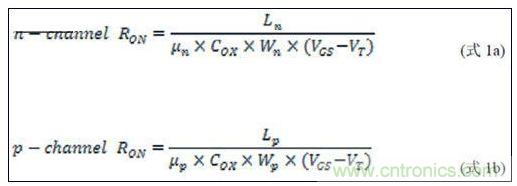 在VIN為各種電平條件下,p溝道和n溝道RON的并聯(lián)值形成并聯(lián)結(jié)構(gòu)的RON特征(圖2)。RON隨VIN的變化曲線在不考慮溫度、電源電壓和模擬輸入電壓對(duì)RON影響的情況下為直線。為使信號(hào)損耗和傳輸延遲最小,理想情況下的RON應(yīng)盡量小。然而,降低RON將增大MOSFET硅片的寬度/長(zhǎng)度(W/L)比,從而造成較高的寄生電容和較大的硅片面積。這種較大的寄生電容降低模擬開(kāi)關(guān)的帶寬。如果不考慮W和L,RON是電子和空穴遷移率(μn和μp)、氧化物電容(COX)、門(mén)限電壓(VT)及信號(hào)電壓、n溝道及p溝道MOSFET的信號(hào)電壓VGS (VIN)的復(fù)合函數(shù),如式1a和1b所示。