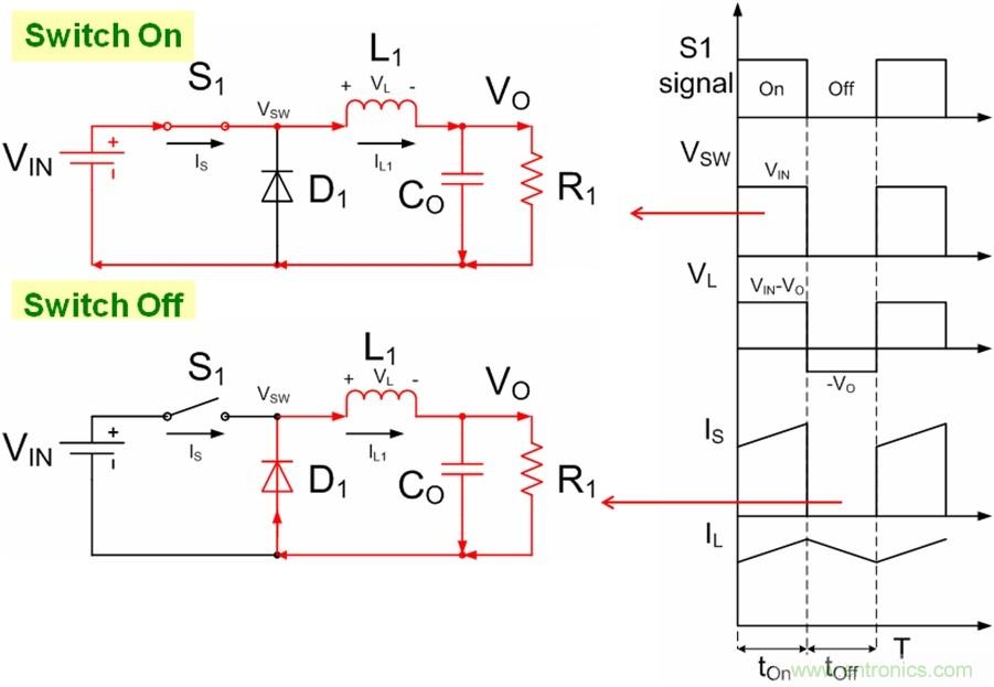 其工作原理為,當(dāng)上管S1開通時,電源VIN向負載供電,電感L1儲能,電感上的電壓為VIN-VO。當(dāng)上管S1關(guān)閉后,電感L1向負載提供能量,電感上的電壓為-VO。圖二所示為電流連續(xù)模式下的BUCK電路的工作原理及波形。根據(jù)電感伏秒平衡可以得到