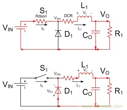 88%只是理想情況下的理論計算值。實際中,需要考慮續(xù)流二極管D1的壓降,開關(guān)管S1的導(dǎo)通壓降,以及電感L1的直流阻抗的壓降,如圖3所示。