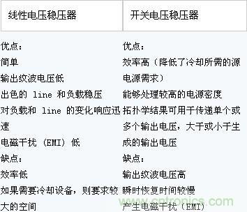 1.線性穩(wěn)壓器與開(kāi)關(guān)穩(wěn)壓器的主要優(yōu)劣勢(shì)特點(diǎn)如下表所示: