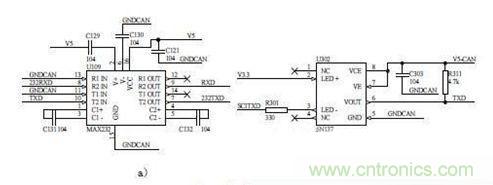 電池管理系統(tǒng)將采集處理后的數(shù)據(jù)通過串口發(fā)送到PC機(jī)界面上,實(shí)現(xiàn)人機(jī)交互。通過串口界面,可以觀察到電池的總電壓、單體電壓、電流、SOC、故障狀態(tài)、充放電功率等參數(shù),還可以通過串口發(fā)送實(shí)現(xiàn)管理系統(tǒng)的在線標(biāo)定。其硬件電路主要基于MAX232芯片,如圖3a)所示。