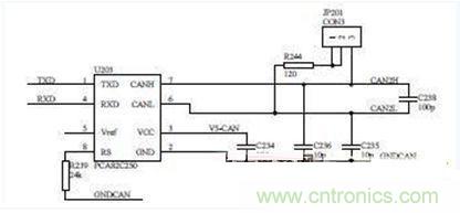在電路中可根據(jù)整車要求,是否接入120Ω的終端電阻,當(dāng)JP201跳線接1腳和2腳時,不接入電阻,當(dāng)接2腳和3腳時,電阻接入。