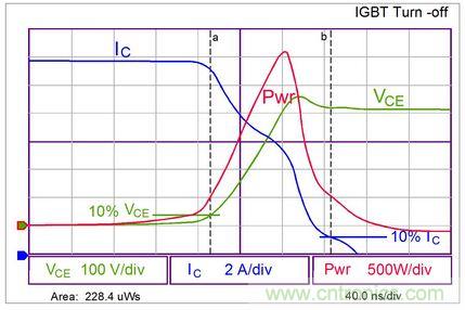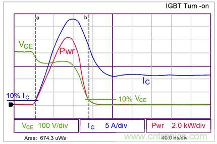 導通時,應當量測起于IC電平10%終于10% VCE點的損耗。這些電平等級相當標準,雖然這樣說也有些主觀性。如果需要的話,也可以使用其他點。無論選擇何種電平來量測不同間隔,重要的是保持一致,使從不同 組件獲取的數(shù)據(jù)能夠根據(jù)相同的條件來比較。功率根據(jù)示波器波形來計算。由于它并非恒定不變,且要求平均功率,就必須計算電源波形的積分,如波形跡線的底部 所示,本案例中為674.3 μW(或焦耳)。