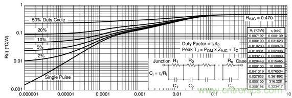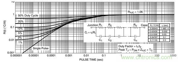 安森美半導體IGBT組件的數(shù)據(jù)表中包含IGBT及二極管θ值圖表。穩(wěn)態(tài)θ值如圖7及圖8中的圖表所示。IGBT的θ值為0.470 °C/W,二極管為1.06 °C/W。計算中還要求另一項熱系數(shù),即兩個裸片之間的熱交互影響常數(shù)ψ。測試顯示對于TO-247、TO-220及類似封裝而言,此常數(shù)約為0.15 °C/W,下面的示例中將使用此常數(shù)。