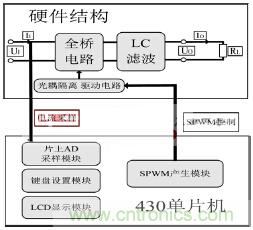 考慮到系統(tǒng)效率,不需要進(jìn)行boost升壓,可以直接逆變。故本系統(tǒng)結(jié)構(gòu)圖如圖1所示。SPWM信號(hào)控制硬件全橋電路,然后經(jīng)過LC濾波電路可以得到正弦波。以MSP430單片機(jī)為核心的數(shù)字控制系統(tǒng)需要采樣電流量、控制硬件電路系統(tǒng)以及形成良好的人際交互界面。