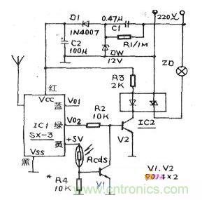 IC1是一只SX-3型人體接近開關(guān)集成電路模塊,該器件最大探測距離可達10米。其中紅線接正電源端,黑線接公共端,黃線為+5v電源輸出端,供外部使用,藍線為即時開關(guān)信號輸出端(本電路不用),綠線為具有時間累積功能的延時開關(guān)信號輸出端。220V市電由C1降壓、D1整流、C2濾波、DW穩(wěn)壓后為控制電路提供12V直流電源。平時,沒有人接近IC1或當行人很快從報欄前經(jīng)過時,IC1的VO2端輸出低電平,后級電路不動作,燈不亮。當有人要看報在報欄前停頓數(shù)秒后,IC1的V02端輸出高電平。白天時,光敏電阻Rcds為低阻值,V1導(dǎo)通,V2截止,后級電路仍不能工作。晚聞Rcds為高阻值,V1截止,的高電平使V2導(dǎo)通,光電耦合器IC2內(nèi)藏發(fā)光二極管發(fā)光,光敏可控硅開通,燈泡ZD發(fā)光。閱報者離開后,IC1V02端又變?yōu)榈碗娖?,ZD自動熄滅。
