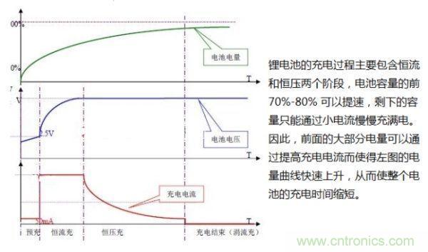 隨著對鋰電池容量的要求越來越高,鋰電池廠家也在加快新型電池的研發(fā),額定充電電壓從傳統(tǒng)的4.2V提高到4.35V,目前又出現(xiàn)了4.4V充電電壓的鋰電池,容量進一步提高。而傳統(tǒng)的充電器輸出電壓為5V,充電控制電路會調節(jié)充電電壓和電流滿足鋰電池的充電特性。不同鋰電池的化學特性不同,因此充放電性能及安全性能也就不同,有的電池芯適合大電流充放電,而有些電池芯可以耐高電壓,所以,采用何種快速充電方式要取決于鋰電池芯的具體特性。提高充電器的輸出電壓可以在恒流階段提高充電功率,實現(xiàn)快速充電。