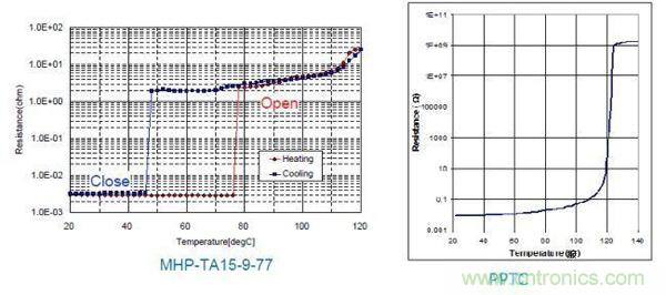 因此,不論哪種方式的快速充電,都是通過提高充電電流或功率來加速鋰電池芯內部的反應來實現(xiàn)的,必須通過更多的保護來防止由于電池芯的熱失控而引起的起火甚至爆炸。TE的PPTC和MHP-TA 可以有效地提供這種保護,MHP-TA是結合了雙金屬片和PPTC的溫度/電流保護器件,溫度保護更加精確,可以適用于電流較大、溫度保護要求更高的電子設備,如:智能手機、平板電腦、超級本、筆記本電腦等。MHP-TA及PPTC的特性及應用如下圖,緊貼電池芯的設計可以使MHP-TA和PPTC更好的感測電池溫度,當電池溫度異常升高時可以呈現(xiàn)高阻,阻礙電池的充放電電流,確保電池的安全使用。
