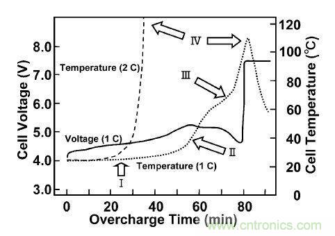 下圖是鋰離子電池過充電測試的一個事例??梢钥闯龀潆娺^程中鋰離子電池芯內部溫度和電壓的變化情況,正常1C充電時,電池芯的溫度隨恒流充電慢慢升高,而隨恒壓階段電流減小慢慢降低,整個過程溫度可控,安全。當大電流(2C或以上)時,電池芯內部反應劇烈發(fā)生熱失控,溫度急劇升高而發(fā)生起火或爆炸。