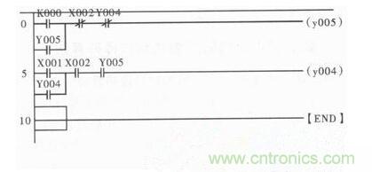 在圖3梯形圖中,PLC外部按鈕所控制的常開觸點主要是左母線的第一等級以及第二等級的X001觸點和X002觸點,只需按鈕便可使得X000或X001任意一個常開觸點閉合,輸出繼電器Y005或繼電器Y004就能通過相應線路形成閉合回路,進而使常開接觸點Y005或Y004實現(xiàn)自鎖功能同時實現(xiàn)電動機的正反轉(zhuǎn)。停止通過PLC外部的按鈕實現(xiàn),按鈕通過釋放X002常開接觸點,使得繼電器斷電引發(fā)電動機停止運轉(zhuǎn)。