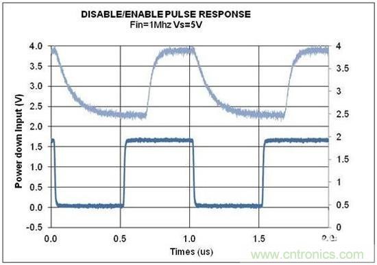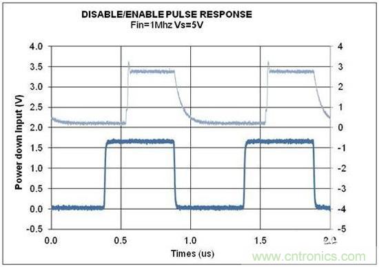 如下圖 2 所示,OPA836具有關(guān)斷功能,其開啟/關(guān)閉速度相當(dāng)快,可輕松適應(yīng)高占空比。