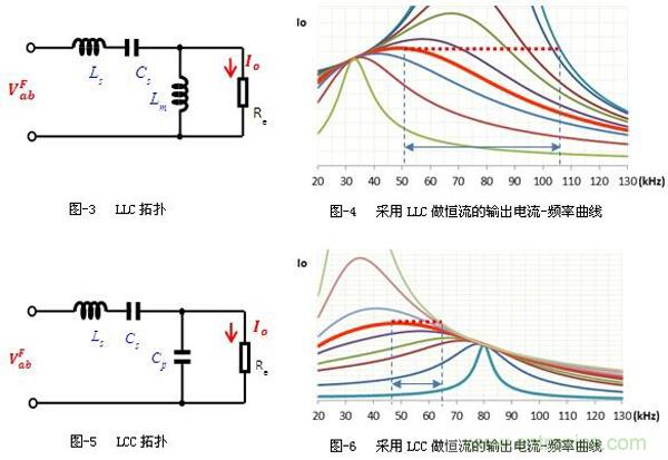 兩圖中虛線是恒流軌跡線,當(dāng)負(fù)載電阻變化時(shí),工作頻率需要做相應(yīng)的變化使得電流保持穩(wěn)定不變,從圖-4中可以看出,采用LLC拓?fù)鋵?shí)現(xiàn)恒流輸出時(shí),不同負(fù)載線之間的間隔較大,意味著頻率變化較大。而從圖-6中可以看出,采用LCC拓?fù)鋵?shí)現(xiàn)恒流輸出時(shí),不同負(fù)載線之間的間隔比較緊密,意味著頻率變化較小。也就是說,LCC拓?fù)鋵?shí)現(xiàn)恒流時(shí),頻率隨負(fù)載變化的范圍比LLC的要小很多。
