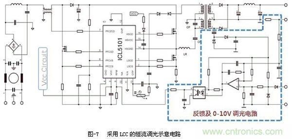 圖-7是LCC拓?fù)浣Y(jié)構(gòu),采用次級(jí)電流采樣做恒流反饋,并能實(shí)現(xiàn)0-10V調(diào)光的示意電路。PFC開關(guān)管采用了英飛凌的高性價(jià)比P6系列CoolMOSTM IPD60R190P6,LCC開關(guān)管采用英飛凌針對(duì)消費(fèi)市場(chǎng)的低成本CE系列CoolMOSTM IPD60R650CE。兩個(gè)型號(hào)均為TO-252貼片封裝,無(wú)散熱器,整體電路非常簡(jiǎn)潔。