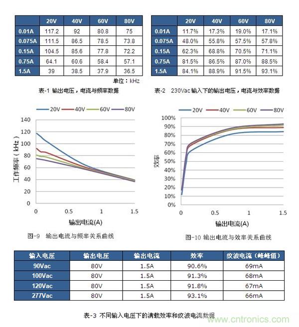在230Vac的輸入條件,80V、1.5A的條件下得到最高的效率93.1%。詳細(xì)數(shù)據(jù)如表-2和圖-10所示。表-3是全電壓范圍下的滿載效率和紋波電流數(shù)據(jù)??梢钥闯黾y波電流的表現(xiàn)也很優(yōu)秀,峰-峰值小于2.5%,都在70mA以下。