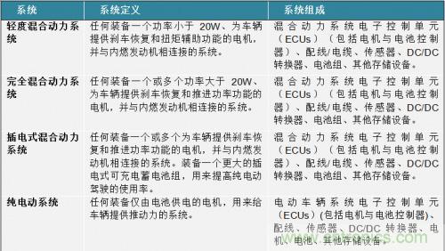 隨著世界范圍的人們對(duì)更高能源效率的交通方式的需求增加,HEV/EVs將首當(dāng)其沖,成為人們的首要選擇的交通方式。為了更好的了解電動(dòng)與混合動(dòng)力車輛市場(chǎng)的潛力與發(fā)展情況,我們不可避免的要知道在本文中提到的是什么類型的車輛。在Strategy Analytics[1]的報(bào)告中:“2007年到2021年混合動(dòng)力車輛系統(tǒng)的需求預(yù)測(cè),”將HEV/EV分為四類: