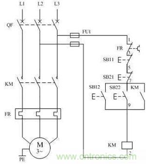 有了點(diǎn)動(dòng)和連動(dòng)的知識(shí),這個(gè)圖中接觸器KM的作用就不必多說(shuō)了。圖中SB11和SB21為停止按鈕,SB12和SB22為啟動(dòng)按鈕。其中把任意一個(gè)啟動(dòng)按鈕和停止按鈕安裝在同一個(gè)按鈕箱內(nèi),另外兩個(gè)也安裝在另外一個(gè)按鈕箱內(nèi)。兩個(gè)按鈕箱可分別放在控制室和電動(dòng)機(jī)旁。