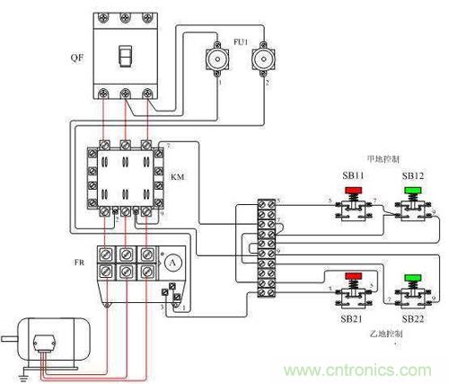 異地控制電動(dòng)機(jī)時(shí),只需要注意,停止按鈕全部串聯(lián),啟動(dòng)按鈕全部并聯(lián)即可。