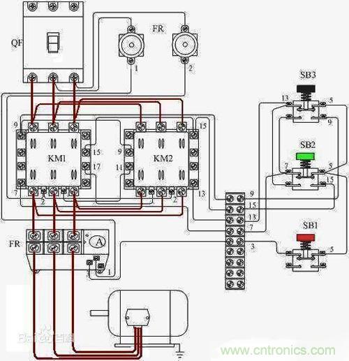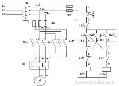 注意看左側(cè)的主回路,三項(xiàng)電L1,L2,L3通過(guò)接觸器KM1到達(dá)電動(dòng)機(jī)M1的順序?yàn)樽?、中、右;而通過(guò)接觸器KM2到達(dá)電動(dòng)機(jī)M1的順序?yàn)橛?、中、左。相序的改變?shí)現(xiàn)了電機(jī)運(yùn)轉(zhuǎn)方向的改變。這一用法用在電動(dòng)汽車或電動(dòng)三輪車上,即可實(shí)現(xiàn)倒車的功能?,F(xiàn)在有一種更方便的元件,叫做“倒順開(kāi)關(guān)”,其原理便是如此。