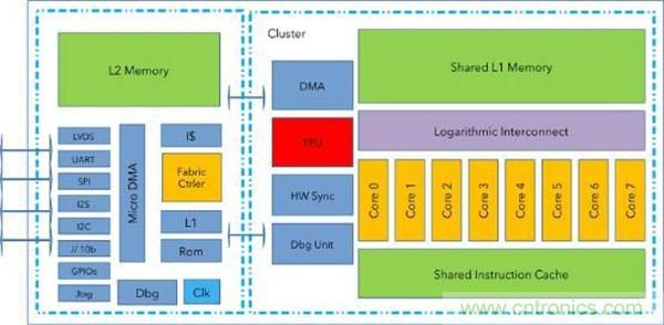GAP8處理器來自義大利波隆納大學(xué)(Universities of Bologna)與瑞士蘇黎世聯(lián)邦理工學(xué)院(ETF Zurich)開發(fā)的RISC-V開放源碼硬體PULP核心技術(shù)轉(zhuǎn)移。GAP8采用8顆PULP核心以及1個(gè)TensorFlow處理器元(TPU),為基于硬體的模式匹配應(yīng)用加速卷積神經(jīng)網(wǎng)路。