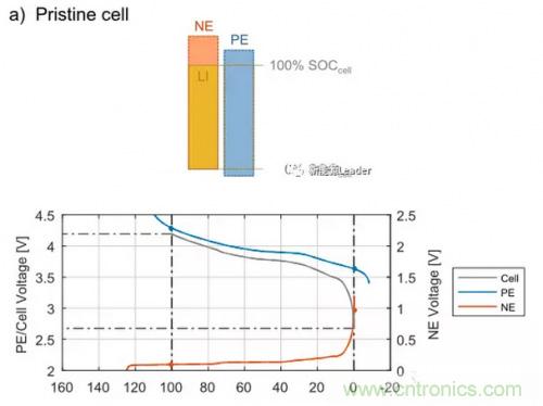 首先Christoph R. Birkl根據(jù)扣式電池極片的面積計(jì)算得到了扣式電池的理論容量,然后通過對(duì)正極極片進(jìn)行充電脫鋰模擬了不同程度的鋰鋰離子損失,通過對(duì)負(fù)極極片進(jìn)行裁切模擬了負(fù)極活性物質(zhì)損失,對(duì)正極極片裁切模擬了正極活性物質(zhì)損失。為了對(duì)試驗(yàn)結(jié)果進(jìn)行分析,Christoph R. Birkl利用柱狀圖建立了一個(gè)物理模型,如上圖所示,其中左側(cè)為負(fù)極的SoC狀態(tài),右側(cè)為正極的SoC狀態(tài),上圖模型為正常電池的模型,從圖上可以看到在正常電池設(shè)計(jì)中,一般會(huì)負(fù)極的容量設(shè)計(jì)的稍微高一些,這一般稱作正負(fù)極冗余,適當(dāng)?shù)娜哂嗫梢员WC鋰離子電池循環(huán)性能,也能在鋰離子電池發(fā)生過充的情況下能夠容納足夠的鋰,確保鋰不析出,保證電池的安全性。