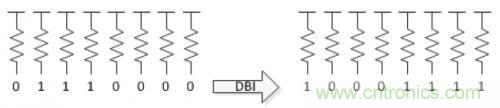所以,一個降低DDR4系統(tǒng)功耗的方法是,盡量加大DDR4輸出高的數(shù)量。這個就是為什么DDR4中多了“DBI管腳”。舉個例子,當8bit lane中有至少有5個DQ都是低時,所有的Bit將會被翻轉,并且DBI(Data Bus Inversion)置低,用來指示數(shù)據(jù)線的反轉。通過這個方法,總共9個信號中(8個DQ和1個DBI),總有至少5個是被驅動為高電平。如果原始的數(shù)據(jù)中有4個或者更多的信號被驅動為高時,那么DBI信號也將會設為高,同樣,還是9個里面至少有5個為高。這樣的話,在每一個數(shù)據(jù)傳輸?shù)倪^程中,都是至少有5/9的數(shù)據(jù)是高電平,可以在一定程度上降低了功耗。