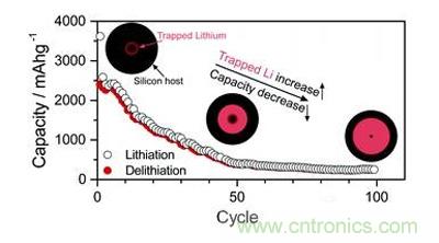 如此往復(fù),惡性循環(huán),導(dǎo)致每次的嵌鋰量逐漸降低。導(dǎo)致顆粒從核心向表層逐漸被鋰化,形成了“死鋰”(如圖2所示)。