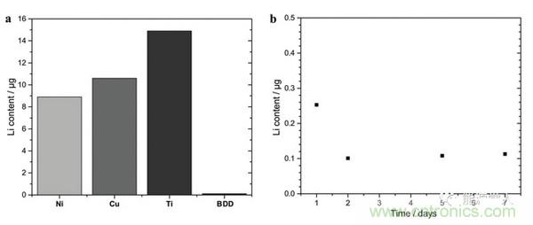圖3. (a)鎳、銅、鈦、硼摻雜金剛石四種物質(zhì)和金屬鋰作用后的質(zhì)量變化柱形圖,(b)硼摻雜金剛石中鋰的時(shí)間-質(zhì)量變化曲線。