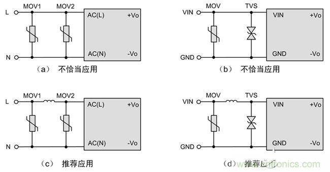 電源模塊體積小,在EMC要求比較高的場(chǎng)合,需要增加額外的浪涌防護(hù)電路,以提升系統(tǒng)EMC性能。如圖1所示,為提高輸入級(jí)的浪涌防護(hù)能力,在外圍增加了壓敏電阻和TVS管。但圖中的電路(a)、(b)原目的是想實(shí)現(xiàn)兩級(jí)防護(hù),但可能適得其反。如果(a)中MOV2的壓敏電壓和通流能力比MOV1低,在強(qiáng)干擾場(chǎng)合,MOV2可能無法承受浪涌沖擊而提前損壞,導(dǎo)致整個(gè)系統(tǒng)癱瘓。同樣的,電路(b),由于TVS響應(yīng)速度比MOV快,往往是MOV未起作用,而TVS過早損壞。