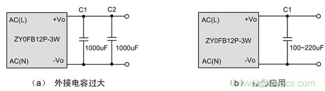 如圖2中的電路(a)所示,一個(gè)3W的模塊,輸出使用了2000uF的電容,而通過查閱產(chǎn)品手冊(cè)了解到,模塊建議最大輸出電容為800uF。輸出電容過大可能導(dǎo)致啟動(dòng)不良,而對(duì)于不帶短路保護(hù)的微功率DC-DC模塊,輸出電容過大甚至可能導(dǎo)致模塊永久損壞。