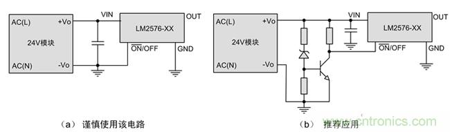 因此推薦使用電路(b),外置簡(jiǎn)單的欠壓鎖定,使24V模塊輸出電壓建立到預(yù)置值后再啟動(dòng)LM2576等外接開關(guān)電源芯片,可以很大程度上避免啟動(dòng)不良問題。