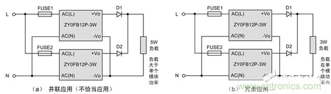 如上圖電路(a)所示,負(fù)載需5W功率,超出單個(gè)模塊的帶載能力,則其中一個(gè)模塊可能存在超負(fù)荷使用的情況。對(duì)于此種應(yīng)用,需使用單個(gè)大于5W功率的模塊,比如ZY0JGB12P-10W。而電路(b)則不然,每個(gè)模塊的功率均能滿足負(fù)載的需要,此時(shí)屬于冗余設(shè)計(jì)。