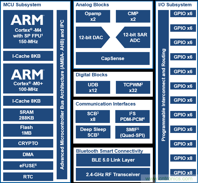 擴(kuò)充處理器容量、內(nèi)存及功耗方面的性能不會憑空而來。對于許多應(yīng)用程序而言,底層硬件(例如MCU)需要做出相應(yīng)調(diào)整以適應(yīng)這些特性。因此,生產(chǎn)商在設(shè)計(jì)下一代MCU時(shí)必須時(shí)刻緊記這些要求。例如,賽普拉斯 PSoC 6 BLE MCU(見圖1)為物聯(lián)網(wǎng)設(shè)計(jì)人員提供BLE 5.0所具備的這些功能。