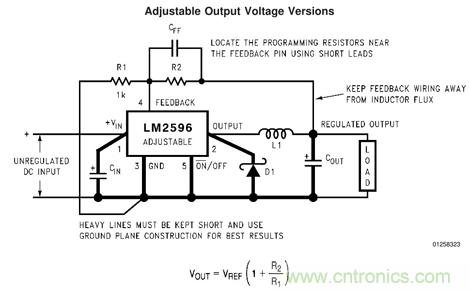DC-DC開關(guān)穩(wěn)壓電路由于其高效率、大電流的優(yōu)點被廣泛使用。可調(diào)DC-DC可以通過調(diào)節(jié)反饋分壓電阻來調(diào)節(jié)輸出電壓。圖1是常用DC-DC降壓穩(wěn)壓芯片LM2596-Adj的典型應(yīng)用電路,通過調(diào)節(jié)R1和R2就可以得到所需輸出電壓。