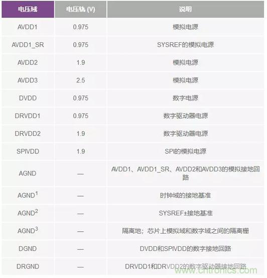 為了改善隔離,設計者必須考慮各種耦合機制。最明顯的機制是通過共享電源域。如果電源域盡可能遠離電路,那么共享同一電壓軌(AD9208為0.975 V)的數(shù)字電路和模擬電路發(fā)生震顫的可能性將非常小。在硅片中,電源已被分開,接地也是如此。封裝設計繼續(xù)貫徹了這種隔離電源域處理。由此所得的同一封裝內(nèi)不同電源域和地的劃分,如表2所示,其以AD9208為例。