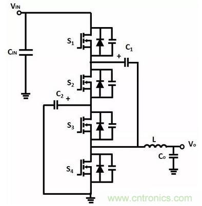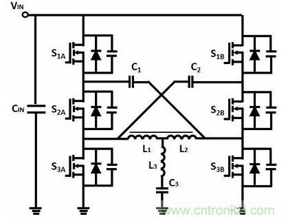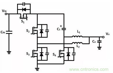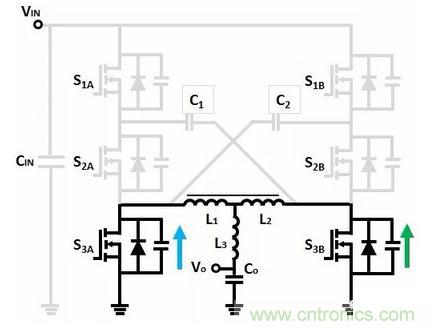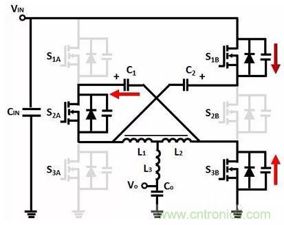 如果C1、C2的電容相等,電感電流等于電容C1、C2的電流之和。S1、S3工作于硬開關(guān)狀態(tài),由于S1、S3的電流降低,因此可以同時降低導通損耗和開關(guān)損耗。
