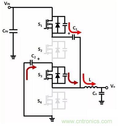 輸出電感激磁,輸入電壓通過C1向輸出負載提供能量,同時對C1充電;C2通過S3對輸出負載放電提供部分電感電流,因此,電感的負載電流由輸入電源(通過S1、C1)和C2同時提供。