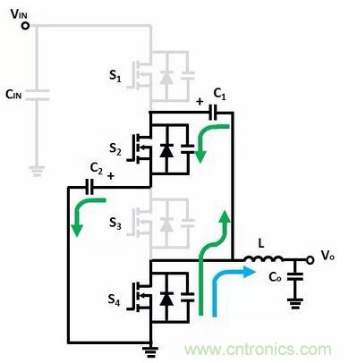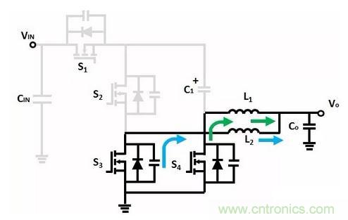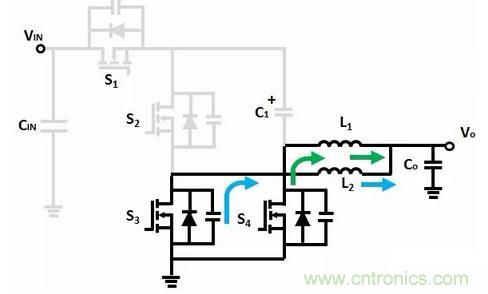 輸出電感去磁,在前面一個階段過程結(jié)束時,由于C1、C2的電壓不平衡,當S2、S4導通后,將C1、C2并聯(lián),所以電壓高的電容將會對電壓低的電容放電,那么,S4不僅流過輸出電感續(xù)流電流,還要流過C1、C2充放電的電流,因此其導通損耗會增加。