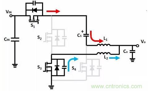 L1激磁,輸入電壓通過C1向輸出負載提供能量,同時對C1充電; L2去磁,S4續(xù)流。
