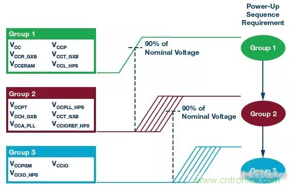 市場中較新的FPGA在規(guī)格中會提供針對啟動和關(guān)斷電源時的序列順序提出特定的要求,確保FPGA正常開啟及復(fù)位,保持最小的電流消耗,并在電源轉(zhuǎn)換期間將I/O保持在正確的三態(tài)配置下。再以Arria 10為例,其技術(shù)規(guī)格將電源分為三個序列組(1、2、3),并要求它們按升序排列為1、2、3,然后按相反的順序降序排列:3、 2、1。