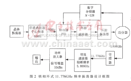 在該頻率振蕩器系統(tǒng)中,利用高穩(wěn)定晶體振蕩源輸出信號經(jīng)過中心頻率為46MHz帶通濾波器,提供一個(gè)高精確的穩(wěn)定參考信號至檢相器,鎖相環(huán)路分頻計(jì)數(shù)器設(shè)置為128,達(dá)到鎖相后VCO輸出5.888GHz固定點(diǎn)頻信號,再經(jīng)過高頻電路倍頻獲得11.776GHz的二次諧波。由于采用的倍頻器基波抑制性能較差,需要通過阻帶濾波和功率放大獲得足夠功率的高穩(wěn)定低相位噪聲的高純度11.776GHz振蕩信號。圖2為整個(gè)頻率振蕩器系統(tǒng)的設(shè)計(jì)框架。