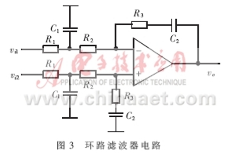 環(huán)路濾波器設(shè)計(jì)——環(huán)路濾波器形式和參數(shù)的選取是整個(gè)鎖相環(huán)電路設(shè)計(jì)與調(diào)試的關(guān)鍵。在壓控振蕩器和檢相器設(shè)計(jì)確定的情況下,環(huán)路濾波器的傳輸函數(shù)直接決定了整個(gè)環(huán)路的傳輸函數(shù),從而在很大程度上決定環(huán)路的噪聲性能、捕獲和跟蹤性能等。在鎖相環(huán)路設(shè)計(jì)中廣泛采用由有源比例積分濾波器組成的高增益二階環(huán)路,因?yàn)檫@種環(huán)路具有無條件穩(wěn)定性,而且有較大相位裕度。但是為了更好地抑制控制線中干擾、提高環(huán)路噪聲抑制性能,在高增益二階環(huán)的基礎(chǔ)上附加一級RC低通濾波器。其電路形式如圖3所示。