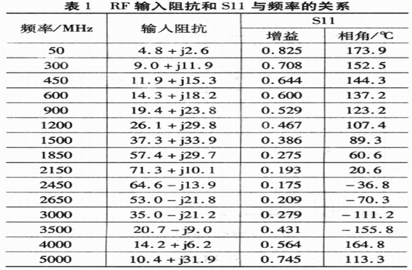 在400 MHz低頻處或3.7GHz處,RF輸入匹配網(wǎng)絡(luò)在原有基礎(chǔ)上增加并聯(lián)電容器C5,如果450MHz下的輸入匹配電容器C5的容值為12 pF,在評(píng)估板的50 Ω輸入傳輸線上,位于距離引腳34.5 mm的位置;900 MHz下的輸入匹配電容C5=3.9 pF,位于距離引腳3 1.3 mm的位置;3.5 GHz下的輸入匹配電容器C5=O.5 pF,位于距離引腳34.5mm的位置。這種串聯(lián)傳輸線/并聯(lián)電容器匹配拓?fù)涫沟肔T5527可用于倍頻標(biāo)準(zhǔn),而不需要修正電路板的設(shè)計(jì)。串聯(lián)傳輸線可用串聯(lián)的片式電感器代替,以使布局更簡(jiǎn)單。RF輸入阻抗和Sl1與頻率的關(guān)系(沒有外部匹配)列于表1。S11數(shù)據(jù)用于微波電路模擬設(shè)計(jì)自定義匹配網(wǎng)絡(luò),模擬和RF輸入濾波器的接口連接。