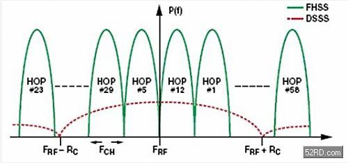 除了FHSS,直接展頻(DSSS)也被新的歐洲法令所納入,在DSSS系統(tǒng)中,窄帶的信號(hào)被乘上一高速虛擬亂數(shù)(PRN)序列,以產(chǎn)生出展頻信號(hào)。每一個(gè)PRN脈沖稱(chēng)為一個(gè)"chip",而序列的速率則是叫作"chiprate"。至于原始窄帶信號(hào)所能展開(kāi)的程度,則是稱(chēng)之為處理增益(processinggain),此為chiprate(RC)對(duì)窄帶資料符號(hào)率(narrowbanddatasymbolrate)的比值。圖二所示為FHSS與DSSS的比較。