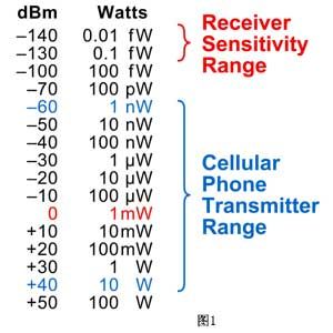 分貝dB是一個相對的值。另一個相關(guān)的單位是毫瓦分貝dBm,它是相對于1mW的絕對功率。圖1給出了dBm的值及其相應(yīng)的瓦特?cái)?shù),其中還給出了移動電話的發(fā)射機(jī)發(fā)射功率參考范圍,以及靈敏接收機(jī)所能檢測到的最低信號功率。圖2給出的等式定義了室溫下射頻信號的理論熱噪聲。由于射頻信號通過空氣的傳輸以及受到大氣干擾和其它信號的干擾,到達(dá)接收機(jī)端的信號電平可能變得非常低。接收機(jī)常常需要檢測低于0.1pW的信號(或者低于微伏的信號電平)。